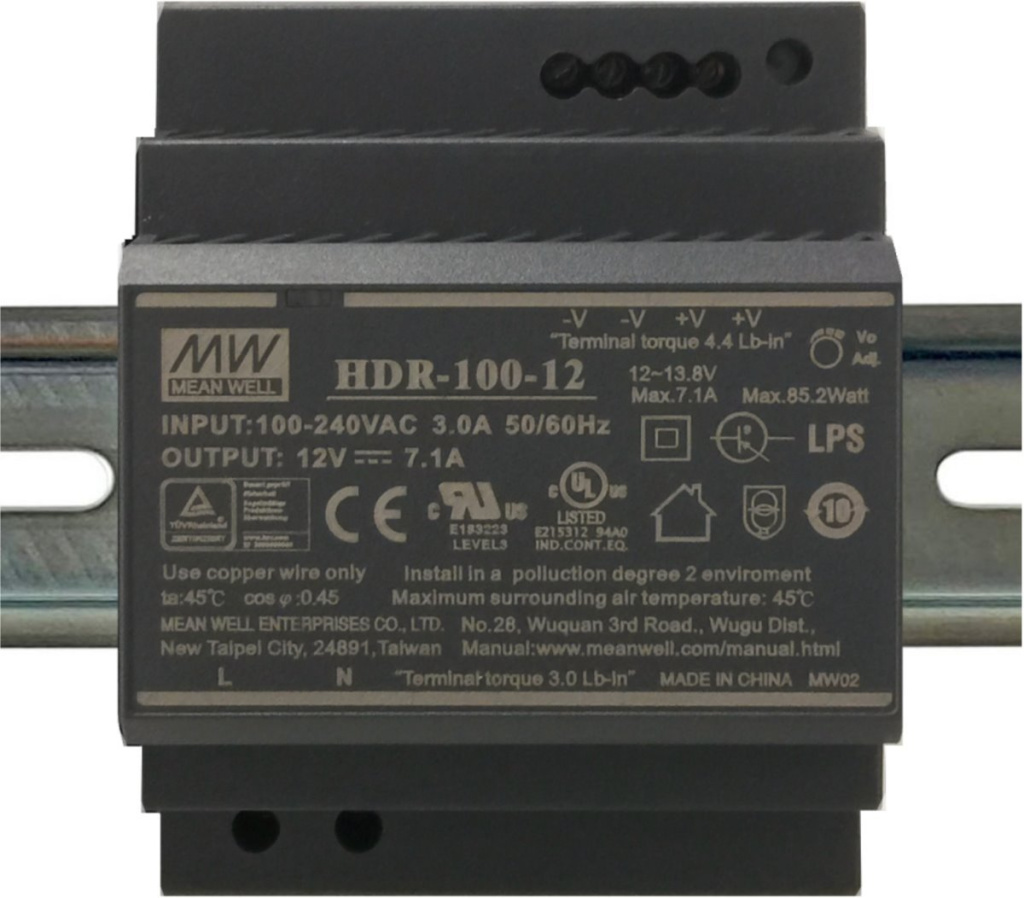 Zdroje řady HDR-100 jsou cenově dostupné ultra tenké zdroje. Model HDR-100-24 poskytuje stejnosměrné výstupní napětí 24V s možností regulace v rozmezí 24V - 25,5V. Montuje se na DIN lišty TS-35/7,5 i TS-35/15, kde zabere 70mm na šířku (odpovídá 4SU). Zdroj je připraven na široké rozpětí vstupního napětí od 85 V AC až po 264 V AC a splňuje evropskou normu EN 61000-3-2.