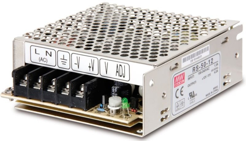 Zdroje řady RS-50 jsou cenově dostupné průmyslové zdroje v kovovém perforovaném šasi. Model RS-50-12 poskytuje stejnosměrné výstupní napětí 12 V s možností regulace v rozmezí 10.8 V - 13.2 V. Zdroj je připraven na široké rozpětí vstupního napětí od 88 V AC až po 264 V AC a splňuje evropskou normu EN 61000-3-2.