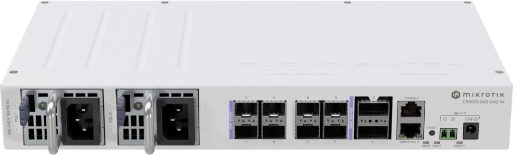 Optický Cloud Router Switch CRS510-8XS-2XQ-IN je vhodné 19" rackmount řešení pro distribuci 100 Gbps sítě a jako malý centrální optický switch, který nabízí 8x SFP28 s rychlostí 25 Gbps, 2x QSFP28 s rychlostí 100 Gbps, 1x ethernetový port s podporou napájení přes PoE a konzolový RJ45 port. Switch lze napájet jak přes dva redundantní Hot-swap zdroje, DC konektor / DC svorkovnici (36 - 57 V DC), tak přes ethernetový port podporující PoE s napětím 43 - 57 V DC nebo 802.3bt. Maximální spotřeba zařízení je 45 W s připojenými SFP porty.